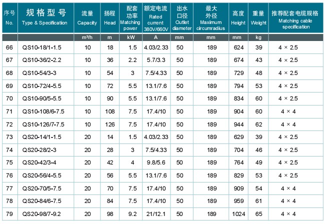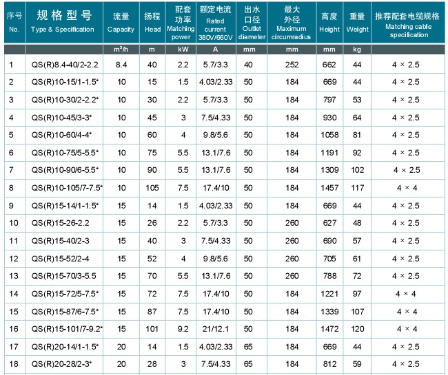 QS型水電泵廣泛用于農(nóng)田排灌、工業(yè)及民用建筑的供、排水系統(tǒng),噴泉工程,以及丘陵、山區(qū)的引水,低洼地區(qū)的排澇等。其特點(diǎn)是:電機(jī)、水泵組成一體,結(jié)構(gòu)簡(jiǎn)單,且安裝拆卸方便,安裝占地面積少,使用維護(hù)簡(jiǎn)單,運(yùn)轉(zhuǎn)安全可靠。目前,我公司可向用戶提供揚(yáng)程5-75米,流量15-250米3/小時(shí),電機(jī)功率0.75-7.5kw等三十幾種型號(hào)的潛水電泵。