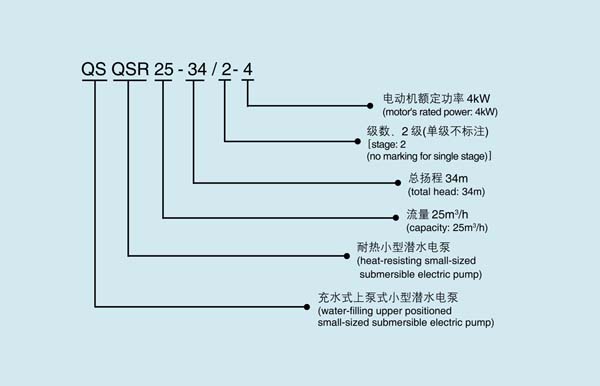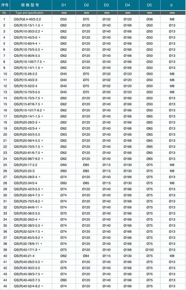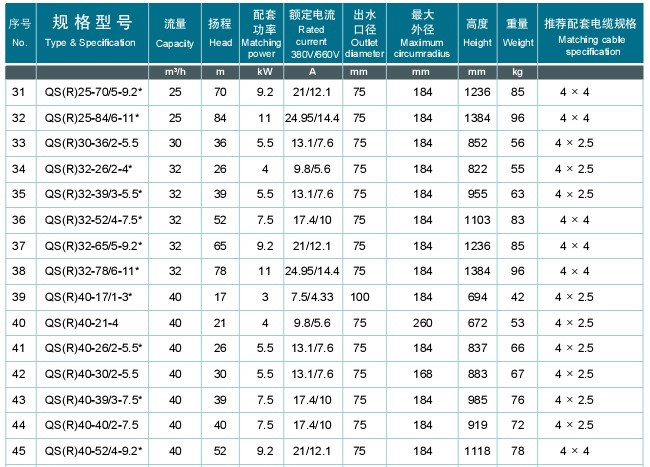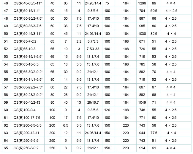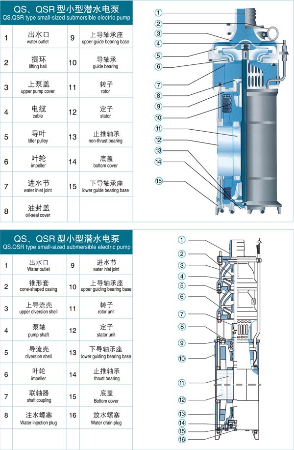 QS型潛水電泵、潛水電機(jī)兩大部分組成。電機(jī)內(nèi)腔采用充水式定子繞組采用聚乙烯絕緣尼龍?zhí)啄退姶啪€,保證電機(jī)在水介質(zhì)中正常工作,定轉(zhuǎn)子表面涂特殊的耐水涂料,轉(zhuǎn)子軸伸端有甩砂器,有效的阻止泥沙與水浸入電機(jī)腔內(nèi),軸承室填充耐水潤(rùn)滑脂,并用骨架油封保護(hù),有效地防止液體進(jìn)入軸承室損壞軸承,電機(jī)腔內(nèi)充入清潔的水,起到電機(jī)冷卻作用。